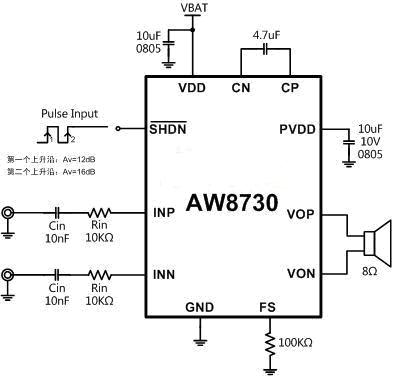 AW8730采用一線脈沖方式控制,一線脈沖控制有兩個狀態(tài),狀態(tài)1的增益為12dB,沒有防破音功能;狀態(tài)2的增益為16dB,開啟防破音功能。完善的保護(hù)功能有效防止芯片在異常工作狀況下?lián)p壞;只需少量的外圍應(yīng)用元件,適合便攜產(chǎn)品應(yīng)用。