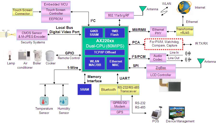 AX220xx內建802.11無線局域網MAC/基帶的單芯片TCP/IP微處理器,提供高性能雙CPU內核及1MB 共享閃存用于程序存儲,內嵌用于主處理器(MCPU)的64KB 數據存儲器及用于Wi-Fi處理器(WCPU)的32KB數據存儲器,內建TCP/IP加速器,兼容于802.11a/b/g的MAC/基帶,高速以太網MAC及豐富的通信外圍設備。