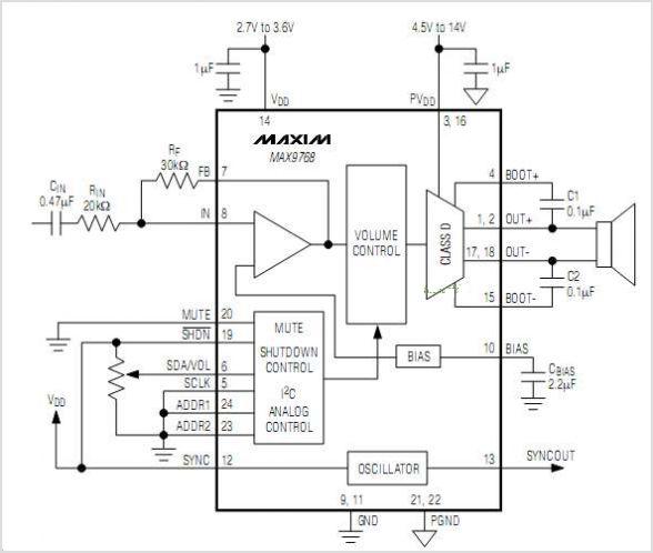 MAX9768具有64級(jí)雙模(模擬或數(shù)字可編程)音量控制和靜音功能。該音頻放大器工作于4.5V至14V單電源,采用14V電源供電時(shí),可向8Ω揚(yáng)聲器提供高達(dá)10W的輸出功率。