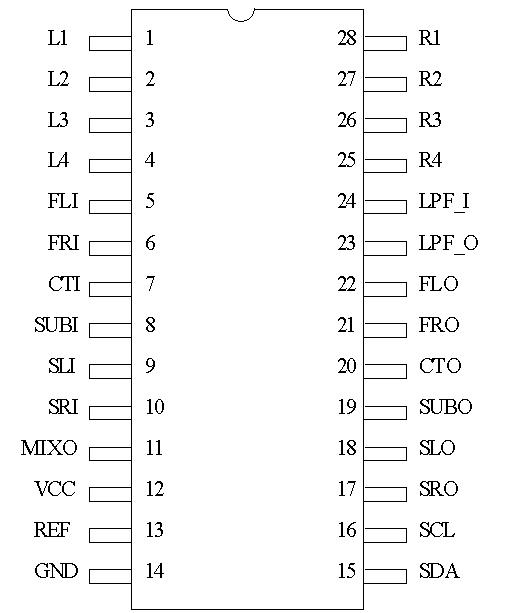 混音聲道意指CT (中央聲道)和SUB(副低頻聲道),這兩個聲道的信號是由L,R信號相加混音而成。原本L,R信號并未加以處理直通FL,FR輸出端,因仍含有完整的同相信號(CT)與副低頻信號(SUB),因此混音聲道為-6dB輸出,以免幅值過大。此混音(-6dB)輸出可以用I2C介面控制其開啟。