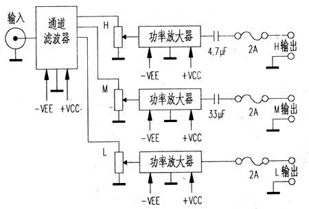 為了改變這種情況,產(chǎn)生了多通道放大器方式。在前置放大器之后用有源濾波器分割頻帶,各頻段有自己的功率放大器和揚(yáng)聲器,各頻段的電平在各功率放大器之前用電位器調(diào)整。這種方式的優(yōu)點(diǎn)是顯而易見的,它取消了前述LC網(wǎng)絡(luò),又能有效地利用各個(gè)揚(yáng)聲器的效率;同時(shí),也降低了對功率放大器的頻率要求,輸出功率也可以小一些;這種結(jié)構(gòu)示于圖1。其關(guān)鍵電路是有源濾波器。