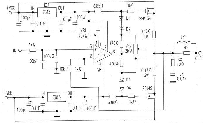 三路濾波器的輸出信號分別接至相同的三個(gè)功率放大器,其電路示于圖6。首先用輸入級為FET的運(yùn)放LF357作電流緩沖,末級功放管采用高頻特性好的MOSFET,偏置電路用二極管和電阻構(gòu)成,利用半可變電阻VR2設(shè)置靜態(tài)電流,靜態(tài)電流的測定可在無信號時(shí)測量源級電阻(0.47Ω)兩端電壓,然后利用公式I=U/R算出。末級負(fù)反饋從MOSFET的源極加到運(yùn)放的反相端。由于用作驅(qū)動(dòng)的運(yùn)算放大器的電源電壓不能過高,限制了功放的最大輸出。如運(yùn)放電源電壓為±15V,驅(qū)動(dòng)級最大輸出電壓為±12V=24V,揚(yáng)聲器阻抗RL=8Ω.則末級最大輸出功率P=Vcc×(Vcc/8RL)=24×24/64=9W。這個(gè)功率似乎偏小,但實(shí)際上這只是一個(gè)頻段的輸出功率,加上另外兩個(gè)頻段的輸出功率,已完全適用。