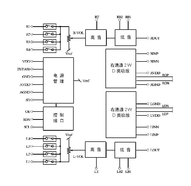 l        2W×2 D類功放(VDD=5V,RL=4Ω)。
