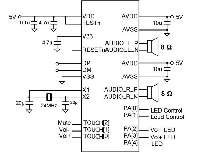 該芯片主要用于USB音箱,這種音箱不需要額外的電源線、音頻線、驅(qū)動(dòng)程序,只需一根USB線與主機(jī)連接即可播放音樂,音質(zhì)可滿足普通大眾用戶需求,方便快捷。同時(shí)該芯片最大特點(diǎn)是內(nèi)置觸控通道及LED燈控制,單芯片就可以很容易的實(shí)現(xiàn)炫酷的觸摸方式調(diào)音,降低了觸控開發(fā)的難度和產(chǎn)品成本。管教兼容TP6902