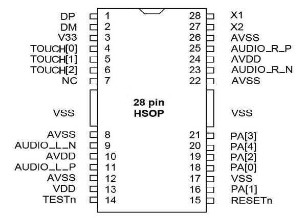 1. LED控制功能位于PIN PA[0],當(dāng)PA[0]接地表示播放音樂時(shí)LED為閃爍功能,空接或接VDD則LED恒亮。