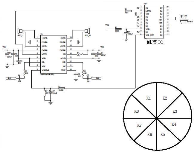 使用觸摸轉(zhuǎn)輪同步控制音量,可以讓用戶在享受美妙音樂的同時,提供極佳的真實觸感反饋及體驗。下圖為電路原理圖: