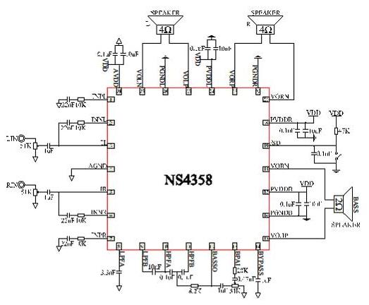 | NS4358 內(nèi)置3D環(huán)繞立體聲音效的2.1聲道(5W+3W×2)低電壓D類音頻功放IC性能介紹及應(yīng)用電路圖說明 |