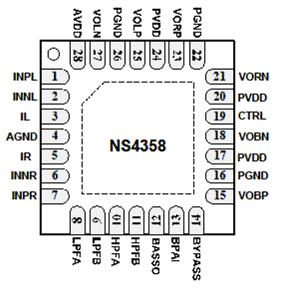 NS4358內(nèi)置過流保護(hù)、過熱保護(hù)及欠壓保護(hù)功能,有效地保護(hù)芯片在異常工作狀況下不被損壞。并且利用擴(kuò)頻技術(shù)充分優(yōu)化全新電路設(shè)計(jì),高達(dá) 90%以上的效率更加適合低電壓,高功率輸出的音頻系統(tǒng)。NS4358提供 TQFN4×4-28封裝,額定的工作溫度范圍為-40℃至85℃。