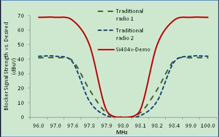 圖5顯示了Si484x系列產品與傳統(tǒng)方案相比所具有的卓越選擇性。其選擇性數值為阻塞器干擾預期接收信號所需的最低δ值。