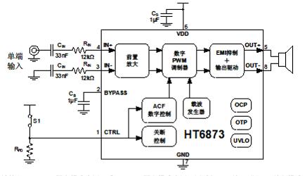 此外,HT6873內(nèi)置的關(guān)斷功能使待機電流最小化,還集成了輸出端過流保護、片內(nèi)過溫保護和電源欠壓異常保護等功能。