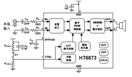 HT6873的最大特點是防削頂失真(ACF)輸出控制功能,可檢測并抑制由于輸入音樂、語音信號幅度過大所引起的輸出信號削頂失真(破音),也能自適應(yīng)地防止在電池應(yīng)用中由電源電壓下降所造成的輸出削頂,顯著提高音質(zhì),創(chuàng)造非常舒適的聽音享受,并保護揚聲器免受過載損壞。針對不同應(yīng)用需求,防削頂具有ACF-1和ACF-2兩種模式,分別對應(yīng)約3%和10%最大THD+N,同時芯片具有ACF-Off 模式。