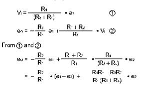 理想情況下, 如果 R1R4 = R2R3, and e1 = e2, 噪聲將會變成0。但是,由于電阻間的失配,噪聲電壓(e1 與 e2)、運算放大器的承受范圍會有差別,因而還是會產(chǎn)生噪聲電壓。