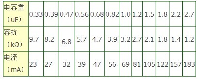 當(dāng)將不同容量的電容器C(如圖1所示),接入AC220V 50Hz的交流電路時(shí),其C的容抗及其所能通過(guò)的電流如附表所列。該電流即電容器C所能提供的最大電流值。