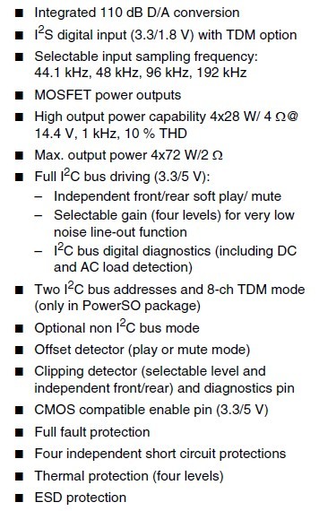 TDA7801: 數(shù)字輸入汽車四聲道音頻功率放大器特點(diǎn)介紹