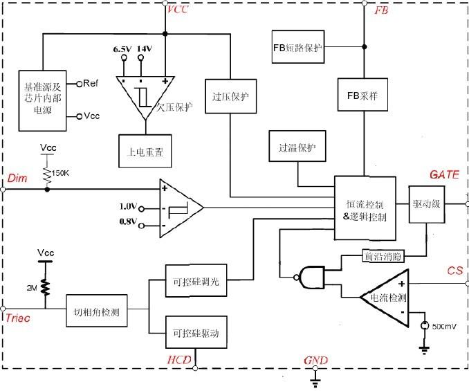 HC3108是一款支持可控硅調(diào)光器的LED恒流控制芯片。適用于輸入全電壓范圍的反激式隔離LED恒流電源。HC3108工作在電感電流斷續(xù)模式,采用原邊反饋模式,無需次級(jí)反饋電路,也無需補(bǔ)償電路即可實(shí)現(xiàn)恒流,極大的節(jié)約系統(tǒng)成本和體積。芯片采用了專利的恒流控制方式,可以達(dá)到優(yōu)異的線性調(diào)整率和負(fù)載調(diào)整率。HC3108芯片內(nèi)部集成了可控硅調(diào)光控制電路,外圍僅需要很少的組件就可與芯片配合實(shí)現(xiàn)調(diào)光功能。調(diào)光范圍寬,無閃爍。HC3108芯片內(nèi)帶有高精度的電流取樣電路,使得LED輸出電流精度達(dá)到±3%以內(nèi)。HC3108具有多重保護(hù)功能,包括LED開路保護(hù)LED短路保護(hù)、芯片過溫保護(hù),過壓保護(hù),欠壓保護(hù), FB短路保護(hù)等。HC3108采用SOP-8封裝。