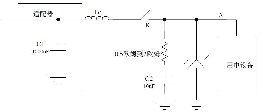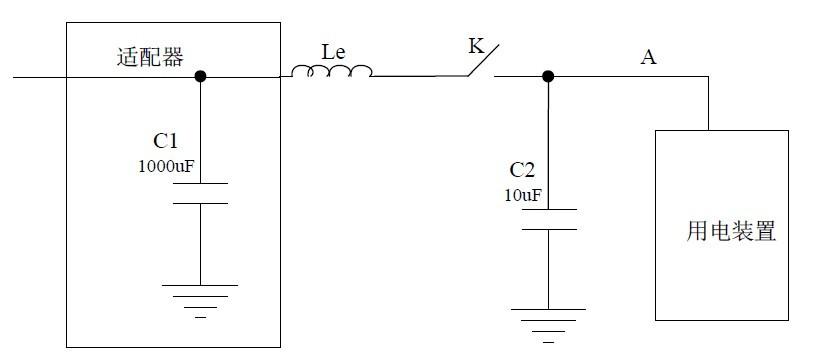 在上圖中,C1為電源適配器的輸出電容,電感Le是電源線的等效電感;電容C2是用電裝置的輸入濾波電容。開關(guān)K可以是用電裝置的開關(guān)或者電源插頭等。