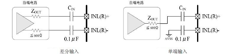 對于差分信號輸入時(shí),通過隔直電容CIN將左聲道信號輸入到INL+ 和INL-端,見圖1。