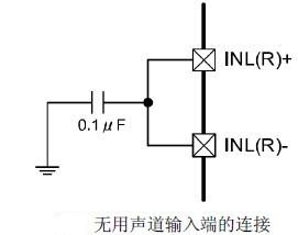 另外,若輸入端(INL+和INL-,或者INR+和INR-)沒有接音源輸入,應(yīng)將沒有用到的通道的兩個(gè)輸入端短接,并通過一個(gè)電容連接到地,見圖3。該電容值與上面所述隔直電容值相同(0.1uF)