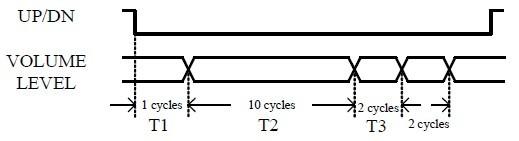 將UP或DN管腳置低電平可實(shí)現(xiàn)音量上升或下降,控制時(shí)序如圖4所示。其中T1為抗抖動(dòng)時(shí)間,經(jīng)過T1后音量上升或下降一階;T2為音量維持不變的時(shí)間,經(jīng)過較長時(shí)間T2后音量繼續(xù)上升或下降一階;此后每隔較短時(shí)間T3,
