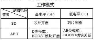 設(shè)置芯片處于AB和D類的工作模式。其邏輯狀態(tài) 如下表: