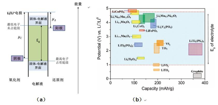 圖1 電解液電勢窗口與電極活性材料氧化還原勢的相對關(guān)系。(a)電解液電化學(xué)勢窗口示意圖。(b)常用電極材料電勢與有機(jī)電解液(1M LiPF6 溶于EC:DEC)的電化學(xué)勢窗口間的相對關(guān)系[2]。
