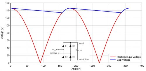 1 和圖 2 顯示了離線電源中使用的兩種整流器配置結(jié)構(gòu)。 1 為一個全波橋接,其中,AC 輸入電壓經(jīng)過簡單整流以后便被送至電容。這種電路常見于寬范圍 AC 230 AC 應(yīng)用中。電容充電至正弦波峰值,然后在大部分半周期放電。電容紋波電流包括兩個部分:首先是充電周期,其電流由電容值和所應(yīng)用的 dV/dt 決定;其次是電容放電。電源起到恒定電源負載的作用,因此電容以非線性速率實施放電,其計算方法為:W = ½ * C *V^2 = P * dt。
