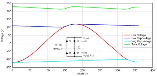 2 描述了一種倍壓器整流配置結(jié)構(gòu),許多 115/230 VAC 應(yīng)用都使用了這種結(jié)構(gòu)。如果您有一個 230 VAC 應(yīng)用,則您的輸入級需要處理最大輸入電壓(265 VAC)乘以峰值因數(shù)這么大的電壓,其接近 400 伏。在與一個 115 VAC 輸入一起使用時,倍壓器將經(jīng)過整流的電壓,增壓至接近 230 VAC 輸入電平。我們可以專為 230 VAC 線壓設(shè)計一個電源,以此來減小電源工作的整流后電壓范圍。我們通常使用一個跳線或者開關(guān),來實現(xiàn)不同整流器配置之間的切換。這種方法的唯一缺點是偶爾出現(xiàn)人為倍增 230 VAC 輸入的情況,從而對電源造成嚴(yán)重破壞。 2 顯示了倍壓器電路的一些波形。電容之間不帶電。兩個整流器交替對每個電容施加輸入電壓。一個周期中,每個電容都被充電至峰值線壓,這樣它們每個都有一個線頻率紋波部分。由于電容為異相位充電,因此其和的紋波頻率為線頻率的兩倍。