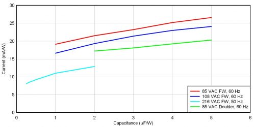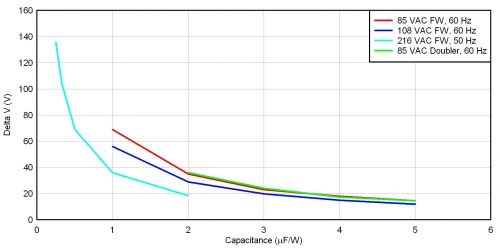3 顯示了四種整流器/輸入電壓方法的 uF/W 標(biāo)準(zhǔn)化壓降。共有三種全波橋接方法,適用于低線壓美國(108 VAC/60 Hz)、低線壓日本(85 VAC/50 Hz)和低線壓歐洲(216 VAC/50 Hz)。另外,還有一個低線壓日本的倍壓器。就全波橋而言,標(biāo)準(zhǔn)化過程只需將電容除以功率。在倍壓器中,標(biāo)準(zhǔn)化方法是將兩個串聯(lián)電容之一的電容除以功率。要想使用該曲線圖,請首先確定您的整流器配置結(jié)構(gòu),并選擇一個可以接受的壓降。之后,您只需讀取輸入電容的 uF/W 便可。最后,通過乘以您的功率,便可去標(biāo)準(zhǔn)化。