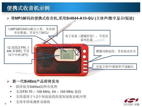 Silicon Labs提供先進的輪調(diào)AM/FM/SW收音機解決方案,Si48xx系列芯片集成了從天線輸入到音頻輸出的完整接收機,節(jié)省了約80%的物料元件數(shù),并集成所有的需要手工調(diào)校的元件,其先進的DSP內(nèi)核將提供卓越的靈敏度、選擇性、信噪比。