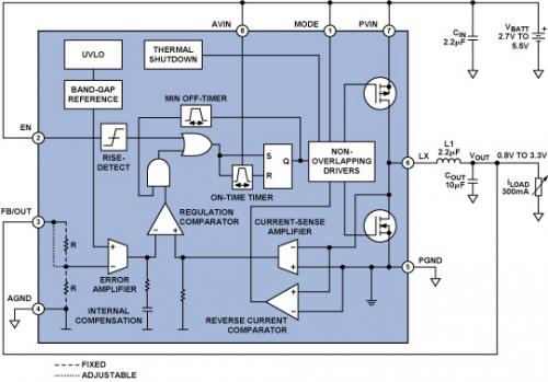 圖1示出了ADI公司ADP2102的典型應(yīng)用電路,這是一款低占空比、3 MHz同步整流降壓轉(zhuǎn)換器。ADP2102具有固定輸出電壓和可調(diào)輸出電壓的多種配置。這里將ADP2102連接成固定輸出電壓配置,由5.5 V的輸入電壓產(chǎn)生300mA、0.8 V輸出電壓。接下來給出輸出電壓可調(diào)的應(yīng)用示例。