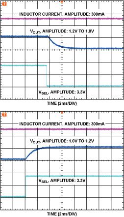 圖4示出了輸出電流IOUT、輸出電壓VOUT和控制電壓VSEL。VSEL為低電平時,輸出電壓為1.0 V,VSEL為高電平時,輸出電壓為1.2 V。