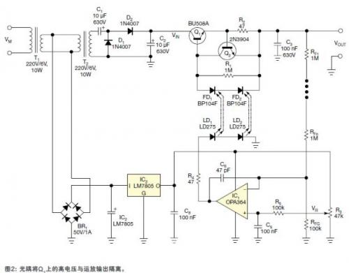 Q2和R2組成了限流電路,當(dāng)輸出電流大于Q2的導(dǎo)通閾值時(shí),簡單地將FD1和FD2光電二極管短接,這種限制與輸出電壓無關(guān)。增加的電容C6用作補(bǔ)償,而晶體管Q1應(yīng)配備一個(gè)至少5 C/W的散熱器。運(yùn)放電源與基準(zhǔn)電壓都取自兩個(gè)變壓器之間的交流信號(hào),采用了整流橋BR1(50V,1A),兩只濾波電容C7和C8,以及穩(wěn)壓器IC 2 (LM7805 )。通過簡單地短接電容C 5, 使VR等于0 , 就可以將輸出電壓切斷。