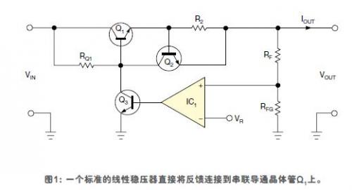 當(dāng)需要寬輸出電壓時(shí)(如實(shí)驗(yàn)室電源) , 電阻R Q1的值必須足夠小,晶體管Q1才能在大輸出電壓范圍下保持足夠的基極電流, 但當(dāng)輸出電壓降低時(shí),這只電阻和晶體管Q3上會(huì)消耗很大功率。另外,Q3還必須能承受最高VIN。
