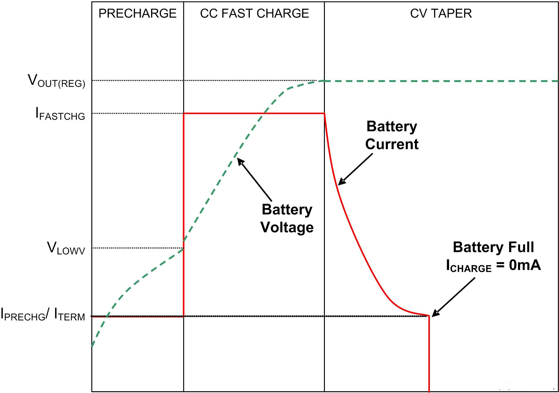 鋰離子電池要求專門的充電周期,以實現(xiàn)安全充電并最大化電池使用時間。電池充電分兩個階段:恒定電流 (CC) 和恒定電壓(CV)。電池位于完全充滿電壓以下時,電流經過穩(wěn)壓進入電池。在CC模式下,電流經過穩(wěn)壓達到兩個值之一。如果電池電壓非常低,則充電電流降低至預充電電平,以適應電池并防止電池損壞。該閾值因電池化學屬性而不同,一般取決于電池制造廠商。一旦電池電壓升至預充電閾值以上,充電便升至快速充電電流電平。典型電池的最大建議快速充電電流為1C(C=1 小時內耗盡電池所需的電流),但該電流也取決地電池制造廠商。典型充電電流為~0.8C,目的是最大化電池使用時間。對電池充電時,電壓上升。一旦電池電壓升至穩(wěn)壓電壓(一般為4.2V),充電電流逐漸減少,同時對電池電壓進行穩(wěn)壓以防止過充電。在這種模式下,電池充電時電流逐漸減少,同時電池阻抗降低。如果電流降至預定電平(一般為快速充電電流的10%),則終止充電。我們一般不對電池浮充電,因為這樣會縮短電池使用壽命。圖1 以圖形方式說明了典型的充電周期。