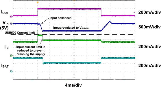 VIN-DPM 通過限制輸入電流阻止脈沖發(fā)生,從而防止輸入源崩潰。圖5 顯示了超負載USB 端口的結果。VIN-DPM 功能開始生效,降低輸入電流限制,從而防止輸入源崩潰。