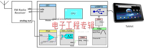 隨著現(xiàn)代可編程SOC的出現(xiàn),除了一些無源器件之外,實(shí)施完整的設(shè)計(jì)不再需要額外的外部元件。SOC可以發(fā)送命令并通過I2C端口從調(diào)FM radio芯片接收狀態(tài)信息。SOC通過已有的 USB接口與平板電腦相連。平板電腦上的前端應(yīng)用可以訪問FM radio信息,用于進(jìn)行頻道掃描和選擇。一旦FM radio接收到鎖定特定頻率的命令,它會(huì)在特定引腳上輸出模擬音頻。FM radio接收器的模擬輸出由SOC進(jìn)一步處理,得到的數(shù)字音頻會(huì)通過USB傳輸給平板電腦。FM radio芯片的工作電源由USB總線提供。大多數(shù)FM radio芯片需要的電流一般只有幾毫安,電壓甚至不到1.8V,USB總線完全能夠滿足這一需求,而且這種功耗對(duì)于便攜式設(shè)備來說完全可以接受。