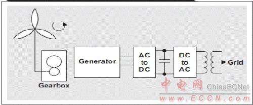 老式的風(fēng)力發(fā)電機(jī)直接連接電網(wǎng),只能工作在電力線頻率下。在經(jīng)過許多作業(yè)點以后,它們變得很低效。新型的風(fēng)力發(fā)電機(jī)(圖1)常常把AC轉(zhuǎn)換為DC,然后再把DC轉(zhuǎn)換回AC,這樣風(fēng)力發(fā)電機(jī)便可工作在各種速度下,從而獲得最大效率。