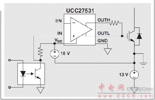 作為一種小型、非隔離式柵極驅(qū)動器,單通道UCC27531可以很好地工作在前述環(huán)境下。它的IC輸入信號通過一個光耦合器或者數(shù)字隔離器提供。它的高電源/輸出驅(qū)動電壓范圍為10到35V,讓其成為12V Si MOSFET應(yīng)用和IGBT/SiC FET應(yīng)用的理想選擇。這里,正柵極驅(qū)動通常更高,并且關(guān)斷時負(fù)電壓下拉,目的是防止電源開關(guān)受到錯誤導(dǎo)通的損害。一般而言,SiC FET由一個相對于電源的+20/-5V柵極驅(qū)動器驅(qū)動。同樣,就IGBT而言,系統(tǒng)設(shè)計人員可能會使用一個+18/-13V柵極驅(qū)動,如圖3所示。