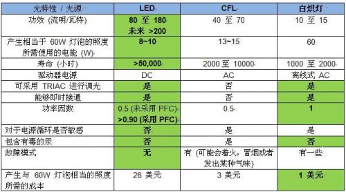 表 1:LED、CFL 和白熾燈光源的比較
