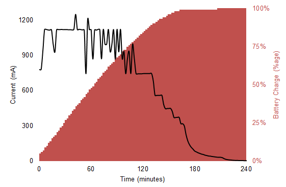 為了展示這一過程,我們對三星Galaxy Note手機進行了充電,并測量了整個過程中的電流,而且與對應(yīng)的電量比例進行了對比。從上圖可以看出,充電初期的電流最高,之后逐漸降低。最后一部分電量的充電時間很長,原因是控制器在放緩電流,避免電池過沖。