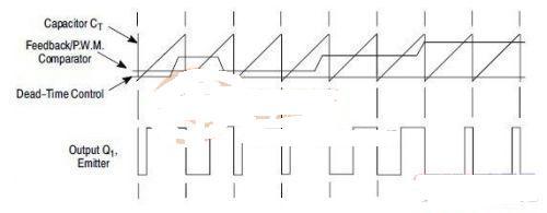 控制信號由集成電路外部輸入,一路送至死區(qū)時間比較器,一路送往誤差放大器的輸入端。死區(qū)時間比較器具有120mV的輸入補償電壓,最小輸出死區(qū)時間約等于鋸齒波周期的4%,即輸出驅動的最大占空比為96%.當把死區(qū)時間控制輸入端接上固定的電壓(范圍在0-3.3V)即能在輸出脈沖上產生附加的死區(qū)時間。脈沖寬度調制比較器為誤差放大器調節(jié)輸出脈寬提供了一個手段:當反饋電壓從0.5V變化到3.5V時,輸出的脈沖寬度從被死區(qū)確定的最大導通百分比時間下降到零。兩個誤差放大器具有從-0.3V到(Vcc-2.0)的共模輸入范圍,這可從電源的輸出電壓和電流察覺得到。誤差放大器的輸出端常處于高電平,它與脈沖寬度調制器的反相輸入端進行"或"運算,正是這種電路結構,放大器只需最小的輸出即可支配控制回路。