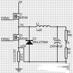 根據整流后的電壓和輸入電流參數,選擇IRF840 為高頻開關管,其最大耐壓VDS 為500V,最大能承受的導通電流ID 為8A,滿足設計要求。工作在高頻工作狀態(tài)的續(xù)流二極管一般選用快恢復的二極管,此處選擇HFA25TB60,能承受600V 的反向壓降,最大導通電流為25A,且恢復時間僅為35ns.輸出部分通過兩個電阻分壓至電壓采樣電路,如下圖12 所示。