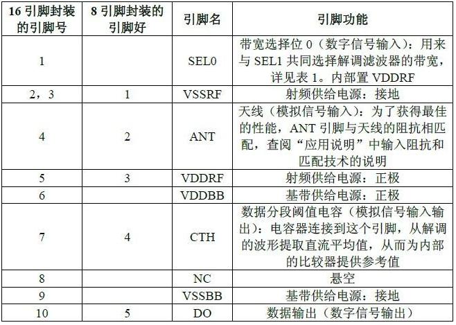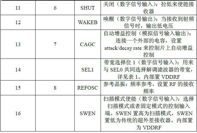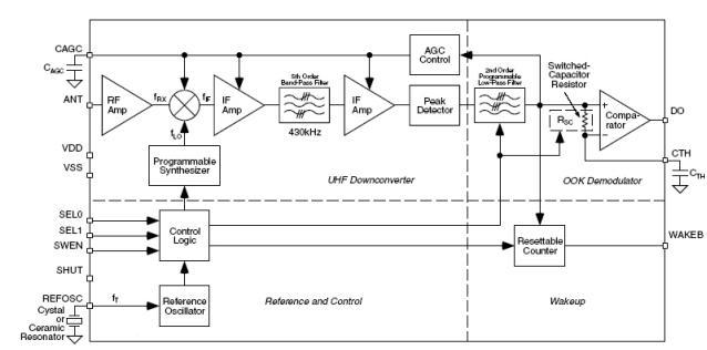 XC4366 框圖”。系統(tǒng)框圖里定義了集成電路的 4 個(gè)部分:降頻轉(zhuǎn)頻器模塊,OOK 解調(diào)器模塊,參考和控制模塊,喚醒模塊。圖中還展示了 2 個(gè)