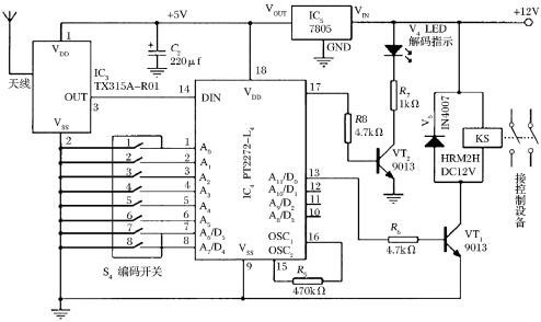 圖2是接收、譯碼控制電路原理圖。主要由無線電接收模塊IC3(TX315A-R01)、數(shù)字譯碼集成電路IC4(PT2272)和控制電路組成。