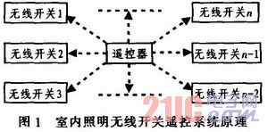 室內(nèi)照明無線控制系統(tǒng)由1個(gè)主遙控器和多個(gè)無線遙控終端(無線開關(guān))組成。由于室內(nèi)距離較短,故系統(tǒng)拓?fù)浣Y(jié)構(gòu)采用星型結(jié)構(gòu),如圖1所示。各個(gè)無線開關(guān)用于控制室內(nèi)各個(gè)照明燈具,在遙控器上有多個(gè)按鍵,用于控制室內(nèi)的無線開關(guān),從而實(shí)現(xiàn)對(duì)照明燈具的無線控制。