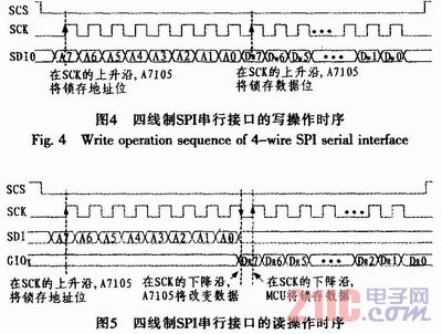 由89C2051單片機(jī)的p1.0作為A7105模塊的片選信號(hào),P1.1為模塊提供串行時(shí)鐘信號(hào)。P1.2與模塊的SDI引腳相連,負(fù)責(zé)地址信息由單片機(jī)輸出和進(jìn)行數(shù)據(jù)寫操作時(shí)的數(shù)據(jù)寫入A7105。P1.3管腳與模塊的GI01相連,當(dāng)進(jìn)行數(shù)據(jù)的讀操作時(shí),由P1.2送出8位地址信息,數(shù)據(jù)則通過GI01管腳被讀入單片機(jī)內(nèi)部。采用四線制,需要對(duì)A7105中的GPI0x的控制寄存器進(jìn)行設(shè)置,這里使用的GI01作為輸出管腳,因此需要將GPI01 Pin Control Register(地址位0Bh)中的GPI01S3~GPI01S0四個(gè)二進(jìn)制位設(shè)置為“0110”即可。四線制的SPI讀寫時(shí)序分別如圖4和圖5所示。