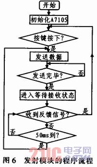 發(fā)射電路在上電之后,首先對(duì)A7105無線收發(fā)模塊進(jìn)行初始化,之后進(jìn)入按鍵檢測(cè)狀態(tài)。若有按鍵按下,則進(jìn)行發(fā)送數(shù)據(jù),之后進(jìn)入等待接收來自接收電路的反饋信號(hào)。在電路初始化時(shí),已將A7105的GI01管腳設(shè)置為高電平,進(jìn)入等待接收數(shù)據(jù)后,如果有數(shù)據(jù)到來,則GI01管腳變?yōu)榈碗娖健.?dāng)數(shù)據(jù)到來時(shí),將GPI01 Pin Control Register(地址位OBh)中的GI01I設(shè)置為1,可以讓GI01管腳輸出反向。發(fā)射電路的系統(tǒng)程序流程如圖6所示。