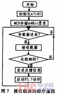 在接收電路中,MCU首先初始化A7105模塊,和存儲(chǔ)64位的地址信息,然后進(jìn)入等待接收狀態(tài)。當(dāng)接收模塊接收到發(fā)送電路發(fā)來的數(shù)據(jù)后,與自己內(nèi)部?jī)?chǔ)存的64位的地址信息進(jìn)行對(duì)比,若相同,則發(fā)送確認(rèn)信息,并控制P3.7管腳輸出低電平,點(diǎn)亮LED,其主程序流程如圖7所示。