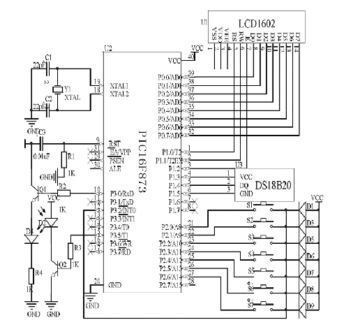 如圖2所示PIC16F873A單片機控制的遙控器發(fā)射電路設計原理圖。該電路主要以PIC50單片機為主控核心,包括行列式鍵盤電路、LCD1602液晶顯示器、DS18B20溫度才傳感器、紅外發(fā)射電路等。