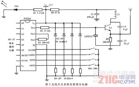 (1) 無線發(fā)射系統(tǒng)電路( 如圖2):主要采用PT2262 芯片來完成,電路PT2262 對按鍵信號進行編碼,可以控制4個通道。圖2 中,PT2262 的1~8 腳是編碼地址端, 每個地址端可以設(shè)定“ 高電平”( 該腳接12 V)、“ 低電平”( 該腳接地) 、“ 懸空” 三種狀態(tài)。10~13 腳是編碼的數(shù)據(jù)輸入端D3~D0( 使用4 位數(shù)據(jù)), 在每個數(shù)據(jù)端連接了一個按鍵, 用以控制不同的設(shè)備。當(dāng)按下按鍵后,按鍵將12 V 的電壓加到對應(yīng)的數(shù)據(jù)端, 同時數(shù)據(jù)端信息通過晶振將信號并發(fā)射出去。PT2262 將會根據(jù)地址碼的設(shè)定和輸入的數(shù)據(jù)進行編碼, 從17 腳輸出編碼脈沖。無線通信受編碼脈沖控制[ 2-3], 當(dāng)17 腳脈沖為“l” 時,V1 組成的振蕩器工作, 產(chǎn)生315 MHz 的高頻信號并發(fā)射出去; 當(dāng)17 腳輸出脈沖為“0” 時,Vl 組成的振蕩器停止工作。
